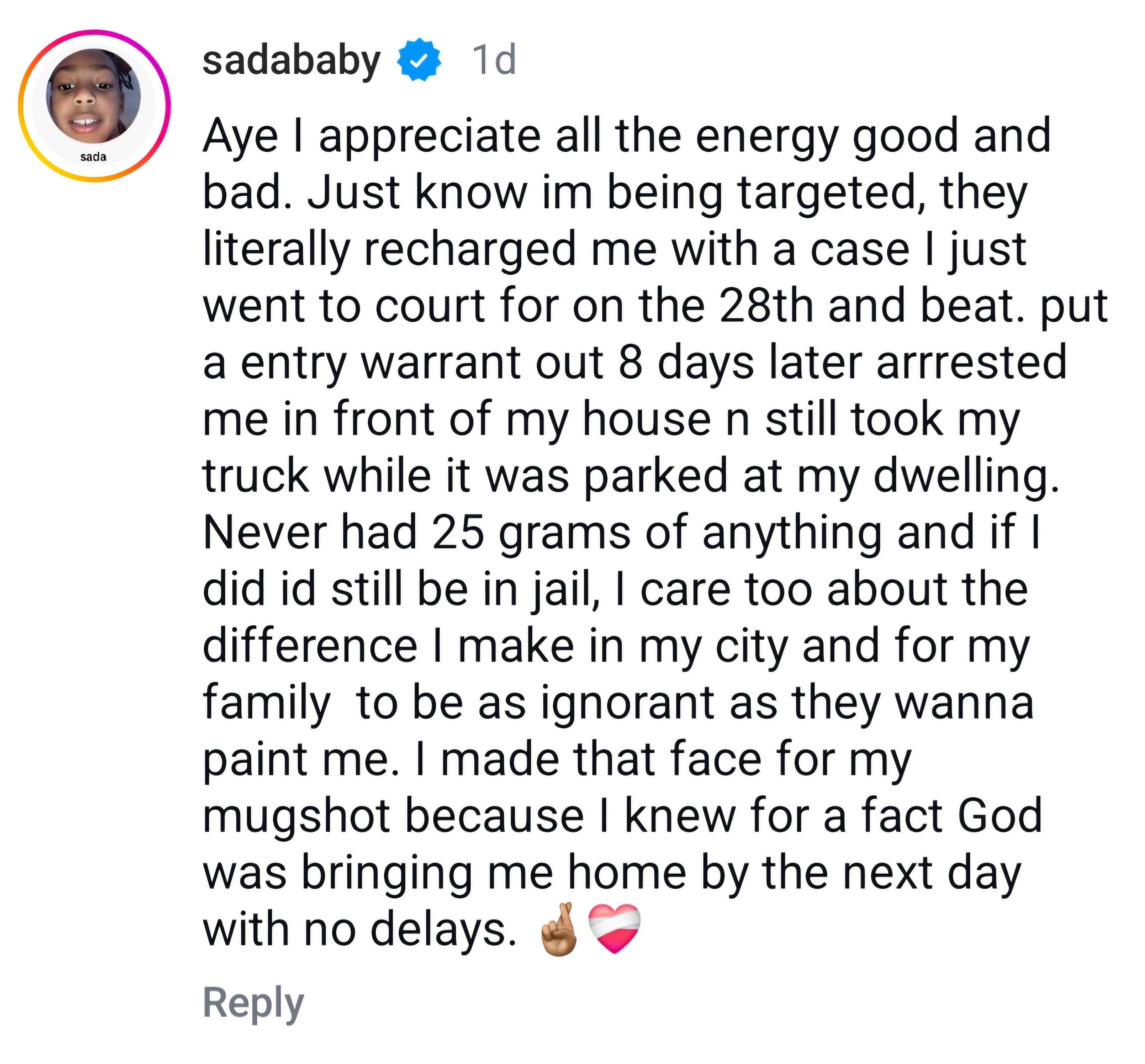 Sada Baby is released after his mugshot goes viral and alleges that he is being targeted.